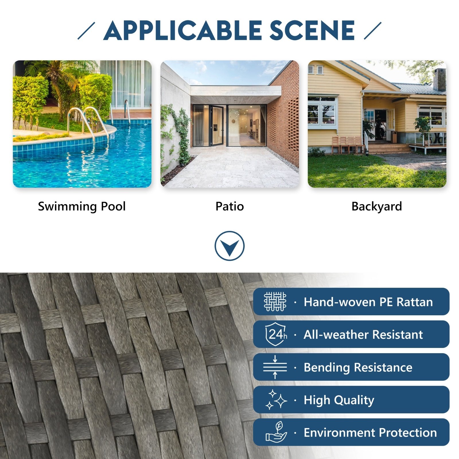 Introducing the Outdoor Sun Bed, known for its durability and style. It’s crafted with high-quality PE rattan materials ensuring longevity, perfect for your outdoor relaxation. All cushions and pillows are zippered for easy cleaning. Measuring 79.9 inches in length and 52.4 inches in width it can comfortably accommodate two adults. The adjustable canopy on the lounger shields you from sunlight, allowing for the ultimate relaxation experience. The half-package stylish curved armrests provide support where needed while still exhibiting elegance. Featuring a comfortable backrest and an sloped angle, you can easily recline while enjoying the outdoors. Don’t worry about bringing extra pillows as the lounger includes two large gray pillows and two colorful decorative pillows. Adjustable feet for uneven ground make you comfortable in any place. Enjoy the best of the outdoors time with this Outdoor Sun Bed!