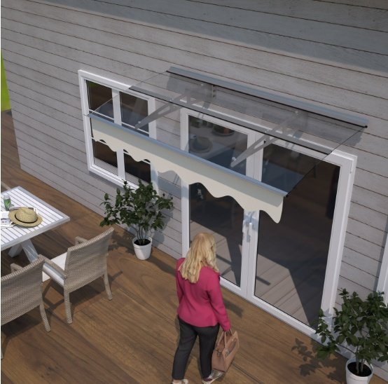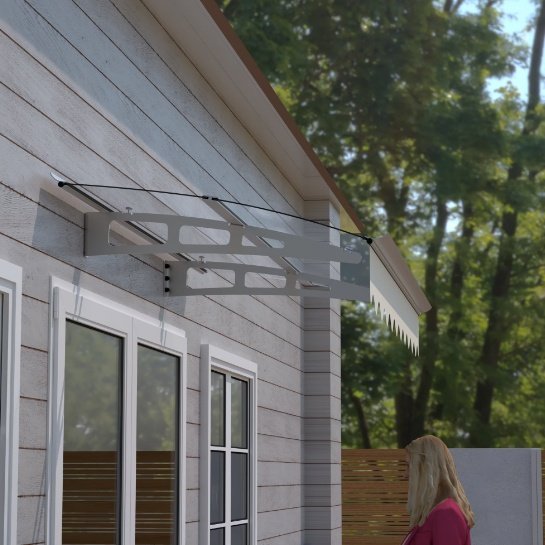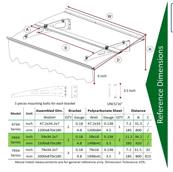 【Premium Solid Polycarbonate Roof】:D A5934W Series Window & Door Awning uses 0.137″/3.5mm thick virtual solid polycarbonate panels with UPF80+ UV protection. Premium panels are independently tested to withstand loads in excess of 350 pounds.