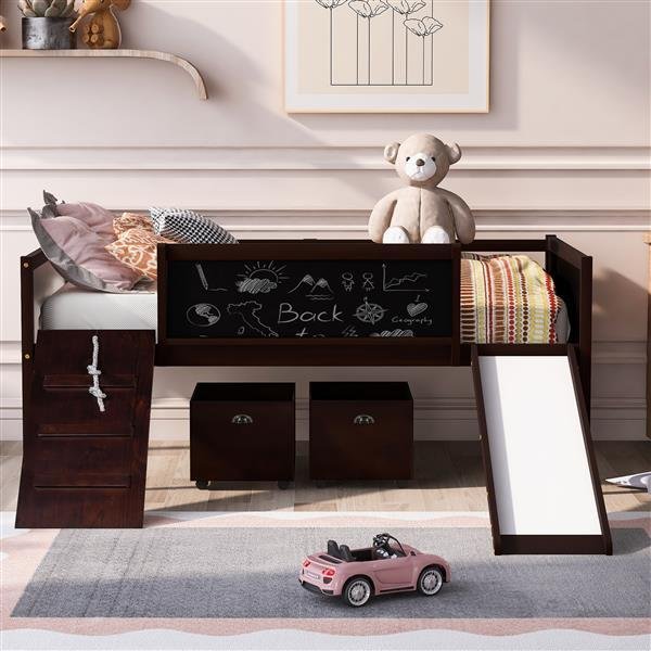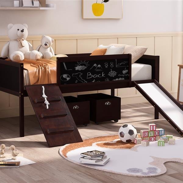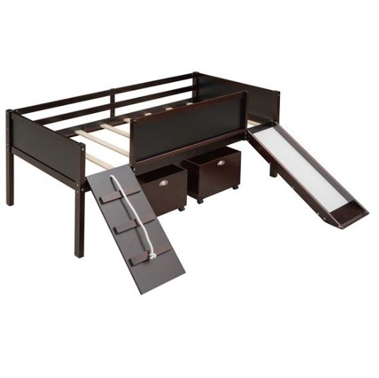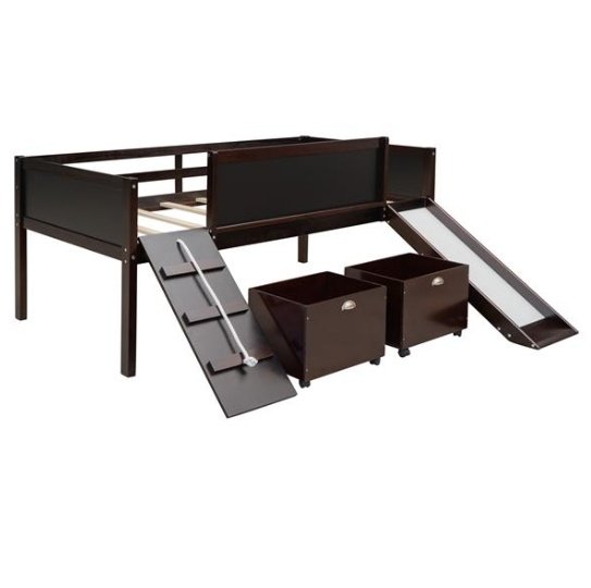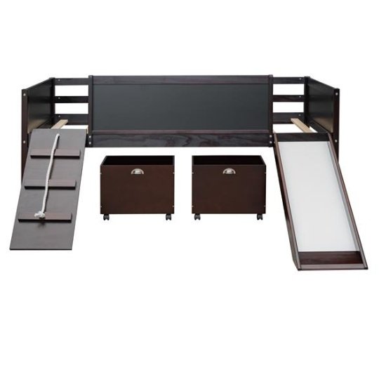 A novel idea be put into design when manufacturing this marvelous loft bed, a ladder be exchanged to a climbing frame which appealed to most people much more. And the way to get out of bed is sliding. This interesting design loft bed offer the chance to train your physical coordination in daily life and push them gain more happiness in bedroom. The double-sided chalkboard set on three sides allow you use your imagination and creativity at any time, and stimulate the potential of your brain. Additional storage boxes is another shining idea in design as they are great useful and helpful tools for parents. The open design storage boxes are the perfect space to store all sorts of toys and daily necessities. Four classic colors make you can choose your favorite color freely.
