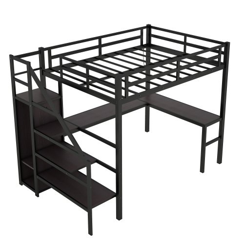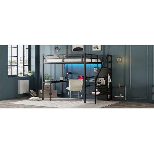 If you need a versatile bed, then our metal loft beds are the perfect choice. The full-size upper bed provides you with plenty of sleeping space, and the desk below is the perfect area to work and study. In addition, the full size loft bed comes with a built-in closet that can be used for storing your daily clothes and supplies, and the interchangeable left and right staircases allow for storage while keeping it sturdy. The USB and LED lights are designed to provide you with great convenience. Quality metal materials and a minimalist black design make this loft bed an eye-catcher in the bedroom.