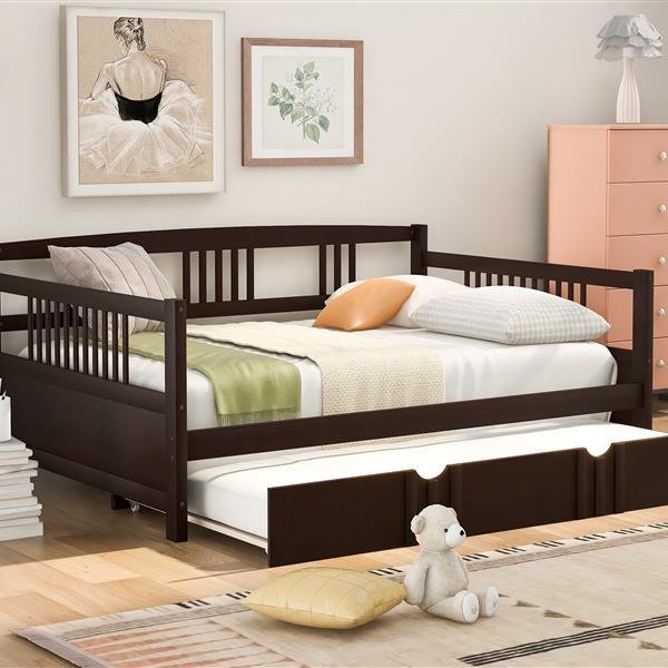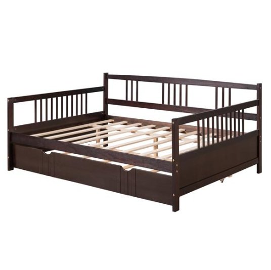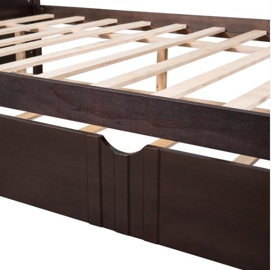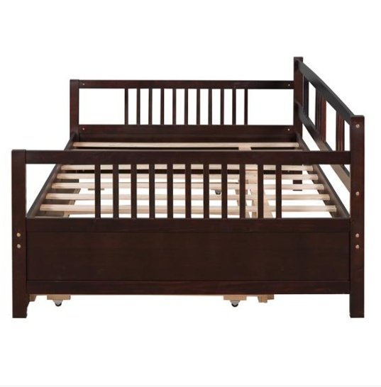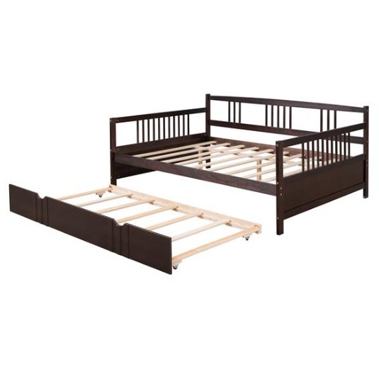 Are you finding a bed or sofa to sleep or have rest in leisure time? Our dual-use daybed frame can be used as sofa or bed. It is a good choice for you. Most of the frame is made of premium pine wood which ensures sturdiness and durability. And the accessories come with the daybed frame are sturdy and antirust so that the bed won’t make any noise and shake after you use it for many years. This full daybed comes with a trundle ,easy to pull in and out, multi-functional piece of furniture ideal for small living spaces. And the appearance of our bed is concise and modern which can suit for any style of decoration.