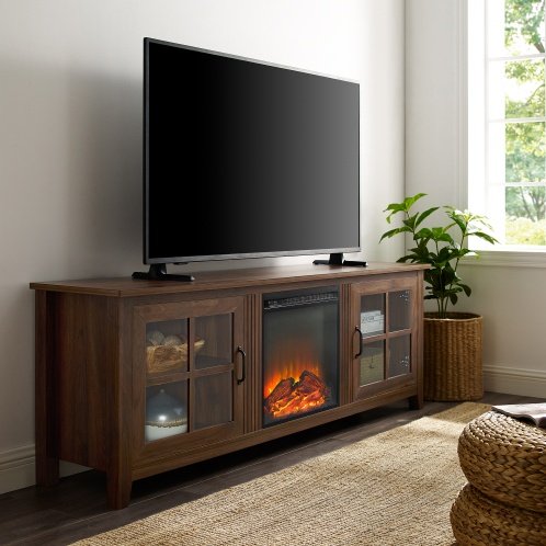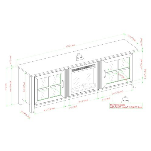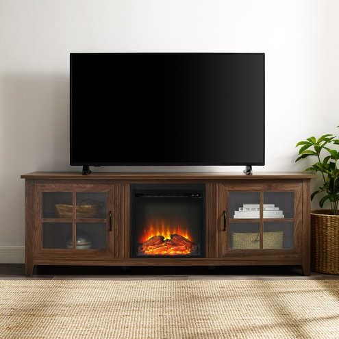 • With window pane glass doors, cord management, adjustable shelves, and 18-inch electric fireplace unit