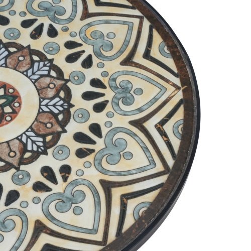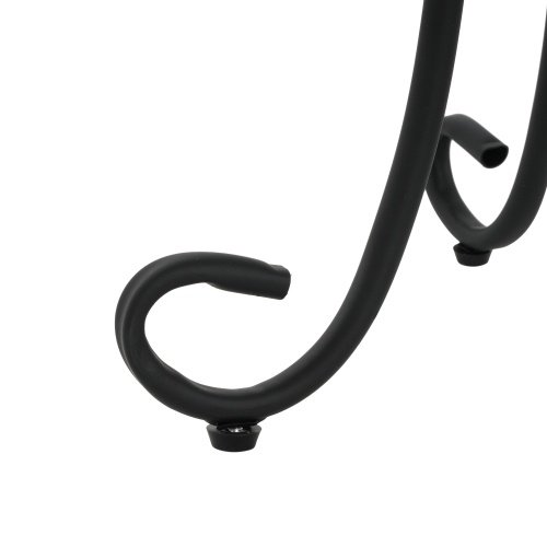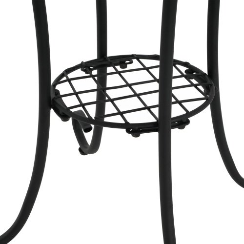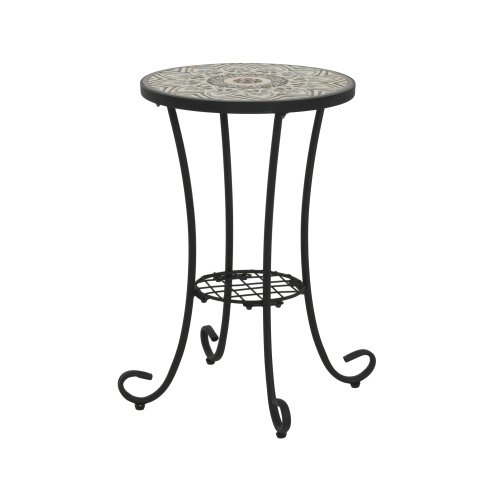 • This vibrant side table updates any room’s aesthetic, whether it’s in a corner of your den or out on your back patio. The ceramic surface showcases a charming floral design in distressed hues of your choice. Its curved, powder-coated black steel frame features scrolling legs with a circular, slatted lower shelf to give you a second platform for potted plants or other décor. This end table’s 14″ diameter means it fits in space-conscious areas anywhere in your home.