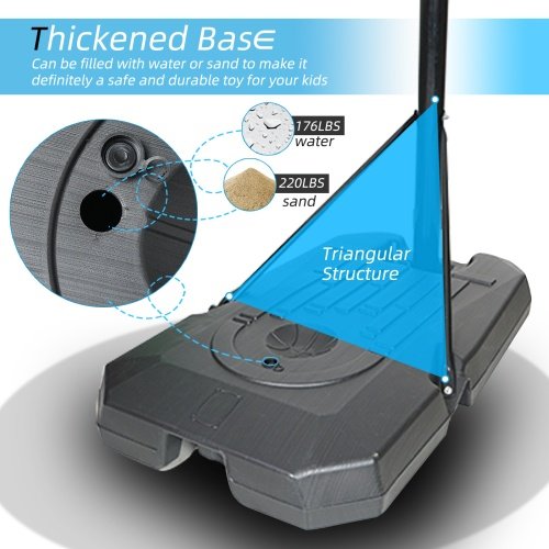 - [EXTRA LARGE STABLE BASE]: The large base ( Dimension: 43.7″(L)x 27.76″(W) x 5.71″(H)) equipped with 2 intakes for sand or water, making the basketball system more stable than others. With two transportation wheels, the whole system can be easily moved from indoor to outdoor.