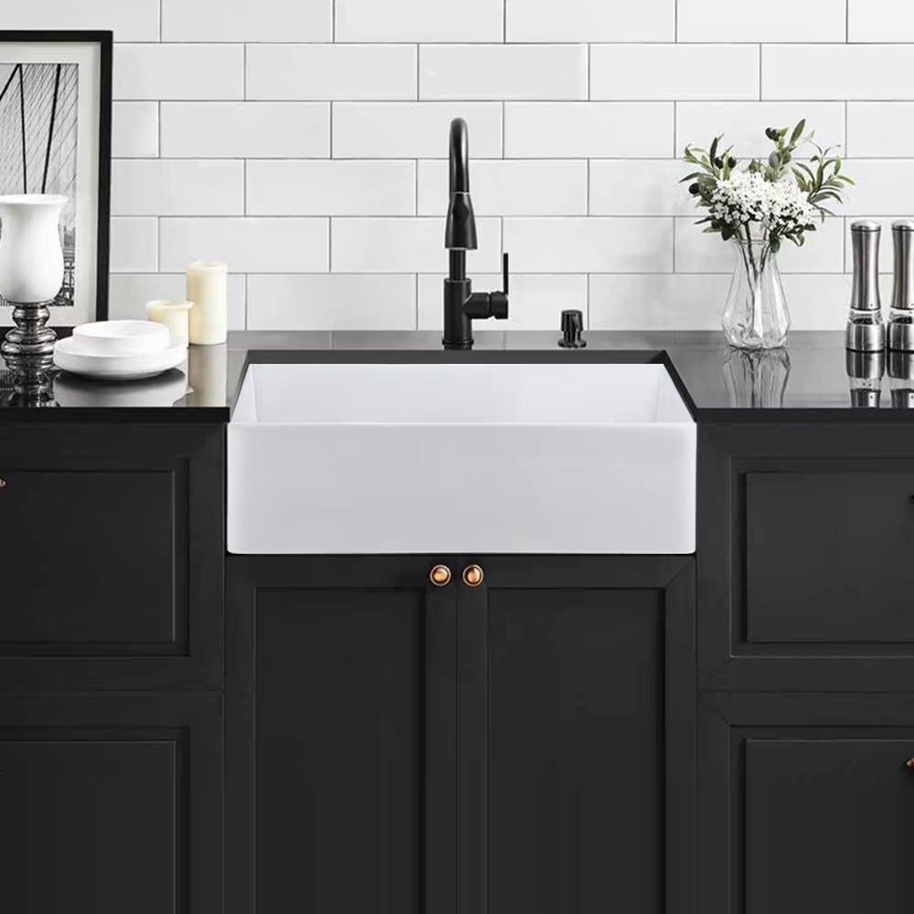 White in color, the kitchen sink is sharp, stylish, and features a convenient single bowl design.Made of cast ceramic, the Farmhouse Sink is a durable addition to any home. The material’s resistance to heat and scratches makes it perfect for a frequently used kitchen. Our products are inspired by vintage farmhouse sinks that create a distinctive clean look. It will not rust, fade, or discolor, providing beauty and durability.