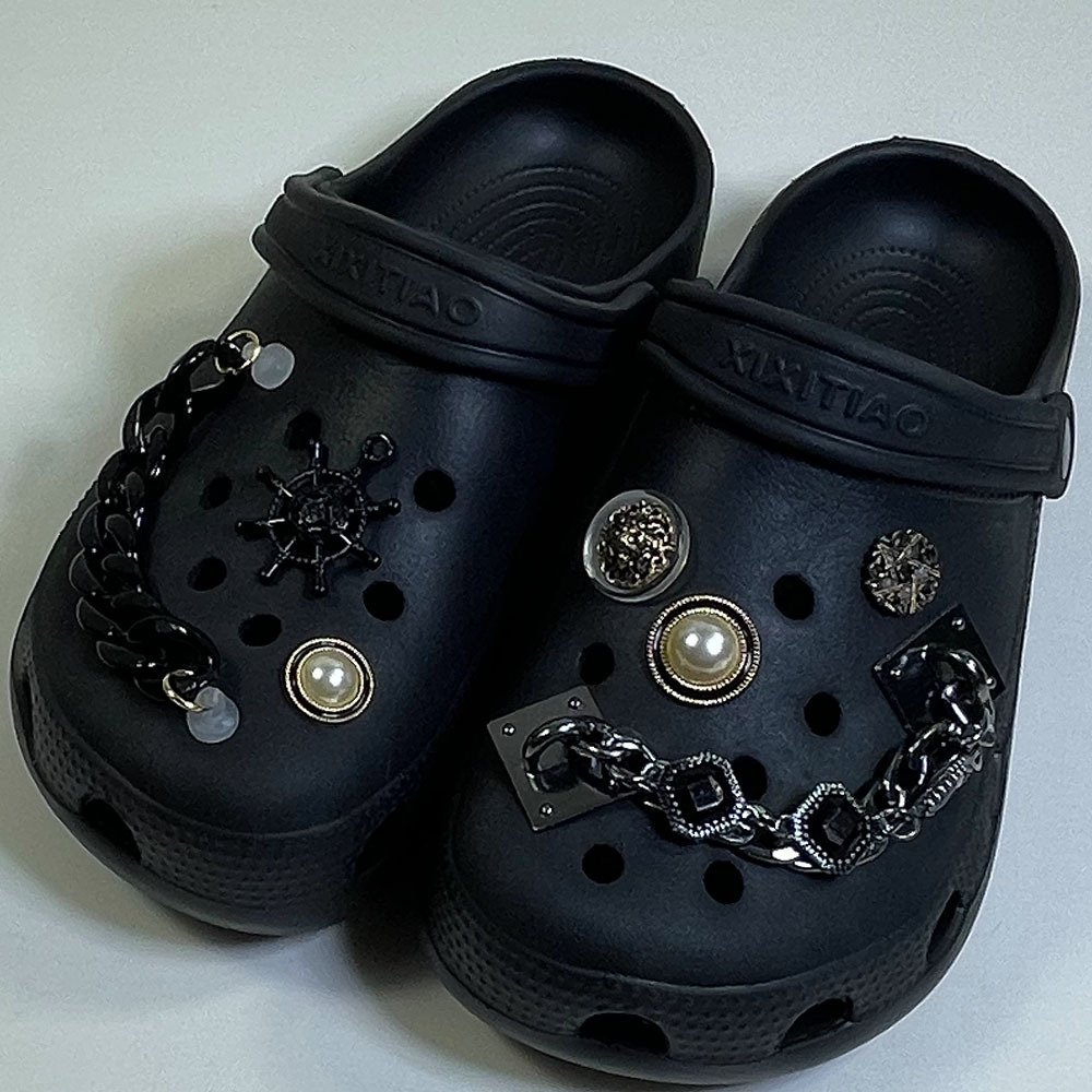 Buckle installation method: 1. Use the bottom of the shoe buckle to align the shoe hole of the vamp and cut into the vamp.