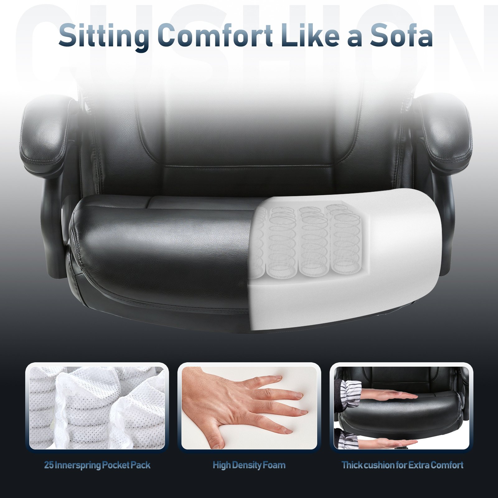24W”, 5″ thick) and a heavy-duty metal base, click to add cart now and you’ll have the perfect sturdy big and tall office chair designed just for you! PAMPER YOURSELF WITH HIGH-END MATERIALS–Not all artificial leather is created equally. Colamy big and tall executive chair is upholstered in bonded leather that is resistant to scratches, stains, peeling, and cracking. With padded armrests and an elegant design look, this heavy duty office chair for heavy people ·400lb will complement your home or office perfectly. FIRST-CLASS SEATING EXPERIENCE–What’s inside the seat of this plus size office chair? High-density molded foam guarantees never-fail comfort and support. What’s more, built-in spring pockets create the same elasticity and comfort as a sofa or mattress. Ergonomically designed super-wide backrest and built-in lumbar support gently wrap your body and support your neck and spine, thoughtful design to keep you comfortable during long hours at work, study, or game. ·HIGHLY ADJUSTABLE, JUST CUSTOMIZED FOR YOU–Featuring a 360° swivel – height-adjustable mechanism – back angle and recline/rock system to rock back and forth at any angle up to 120°. Underneath tilt tension knob controls the tension of reclining, you can adjust the large chair to fit your personal preferences ·CERTIFIED COMFORT, INVEST IN QUALITY–Each part of this high back office chair was carefully selected and finished to perfection. An investment that helps you worry less, and do more. Bonded leather material provides you with a better touch feeling. Smooth-rolling wheels. Class 4 gas cylinder by SGS certified. Powerfully supportive metal base. All tested over 100,000 times and certified for safety and quality. BIFIMA certification, more reliable and sturdy. ·RISK-FREE PURCHASE,BUY WITH CONFIDENCE!–Complete customer satisfaction is our top priority! If you have any questions about our oversized office chair, please do not hesitate to contact us by email (The contact info is included in the manual ), we will spare no effort to assist you to solve any problem!