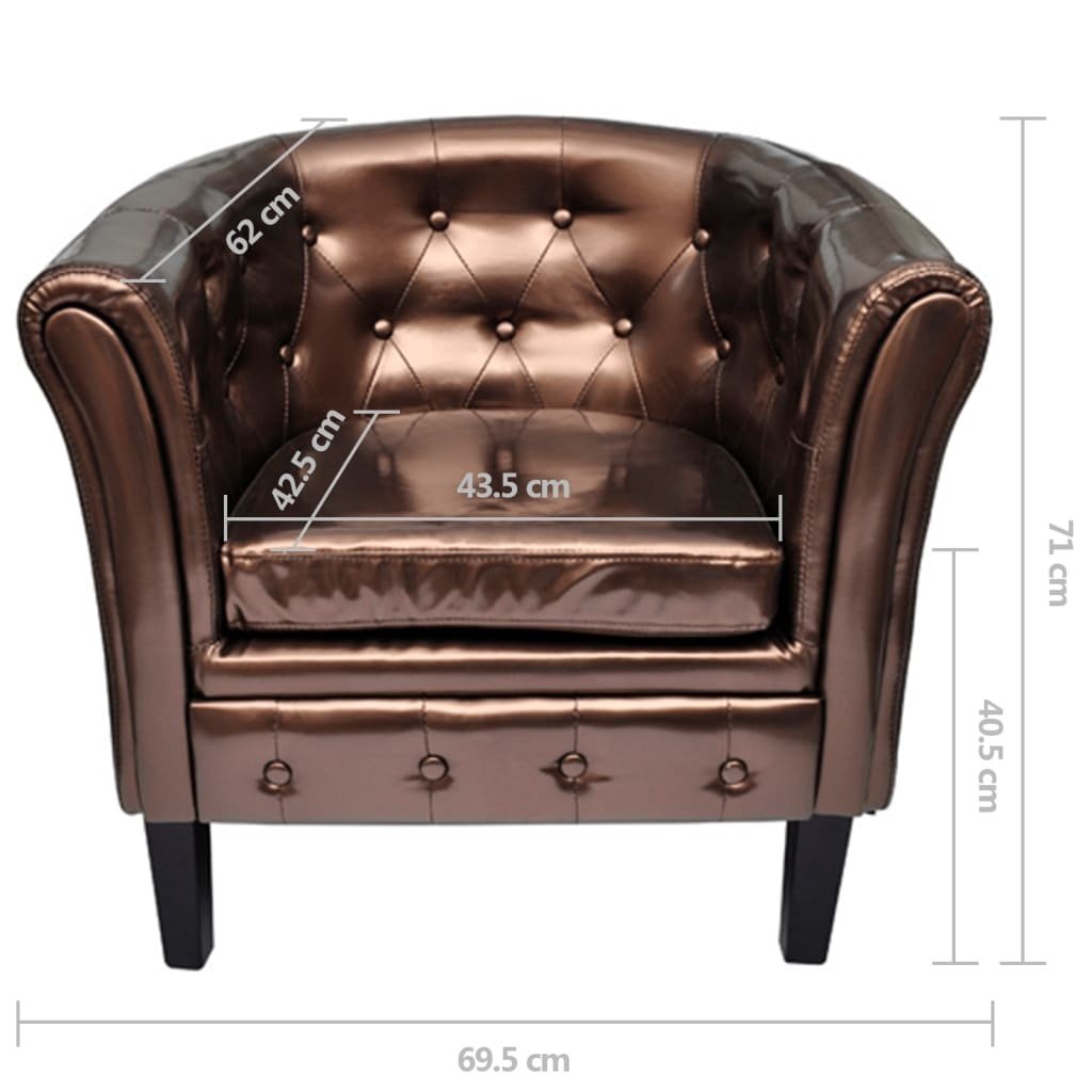 Features:This tub chair will create an elegant ambiance in all waiting and reception areas, offices and private residential areas. With its tufted and studded detailing and gracefully curved arms, this armchair will add a touch of luxury, class and style to any interior. The thickly padded seat is highly comfortable, while the wooden structure is sturdy and durable. The quality artificial leather upholstery is easy to clean and hardwearing.Color: BrownMaterial: Wooden frame + artificial leather upholsteryArmchair dimensions: 27.4″ x 24.4″ x 28″ (W x D x H)Seat dimensions: 16.7″ x 17.1″ (W x D)Seat height from the ground:15.9″Max. loading capacity: 242.5 lbFabric: Cotton: 5%, Polyester: 4%, Polyurethane: 2%, PVC: 89%California Proposition 65WARNING: California’s Proposition 65Specifications:Color: BrownMaterial: Wooden frame + artificial leather upholsteryArmchair dimensions: 27.4″ x 24.4″ x 28″ (W x D x H)Seat dimensions: 16.7″ x 17.1″ (W x D)Seat height from the ground:15.9″Max. loading capacity: 242.5 lbFabric: Cotton: 5%, Polyester: 4%, Polyurethane: 2%, PVC: 89%California Proposition 65WARNING: California’s Proposition 65